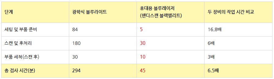 동일한 정확도로 동일 환경에서 동일 금형을 검사했을 때, 광학식(블루라이트) 스캐너는 레이저(핸디스캔)보다 6.5배 더 많은 시간이 소요되었습니다. |